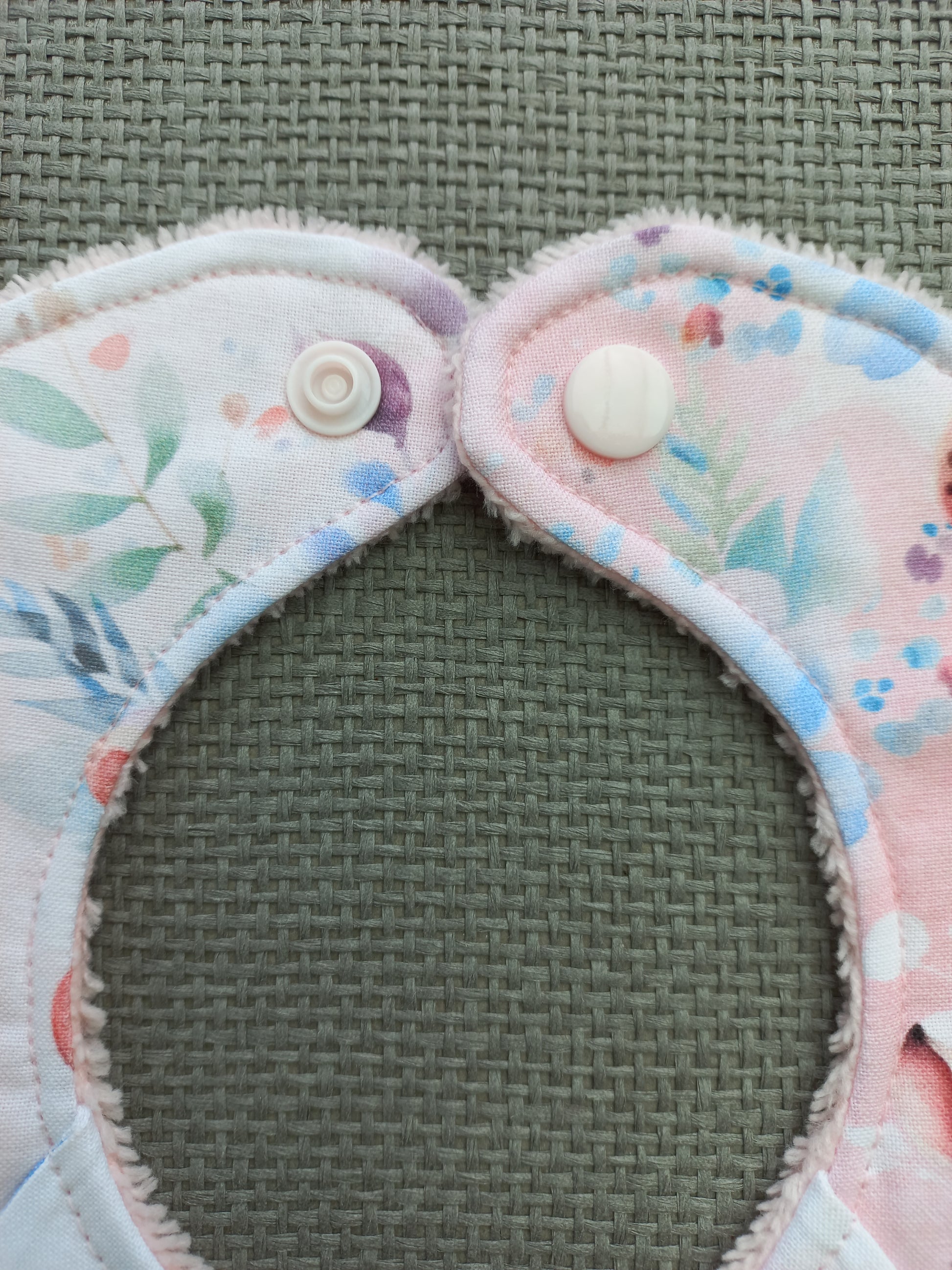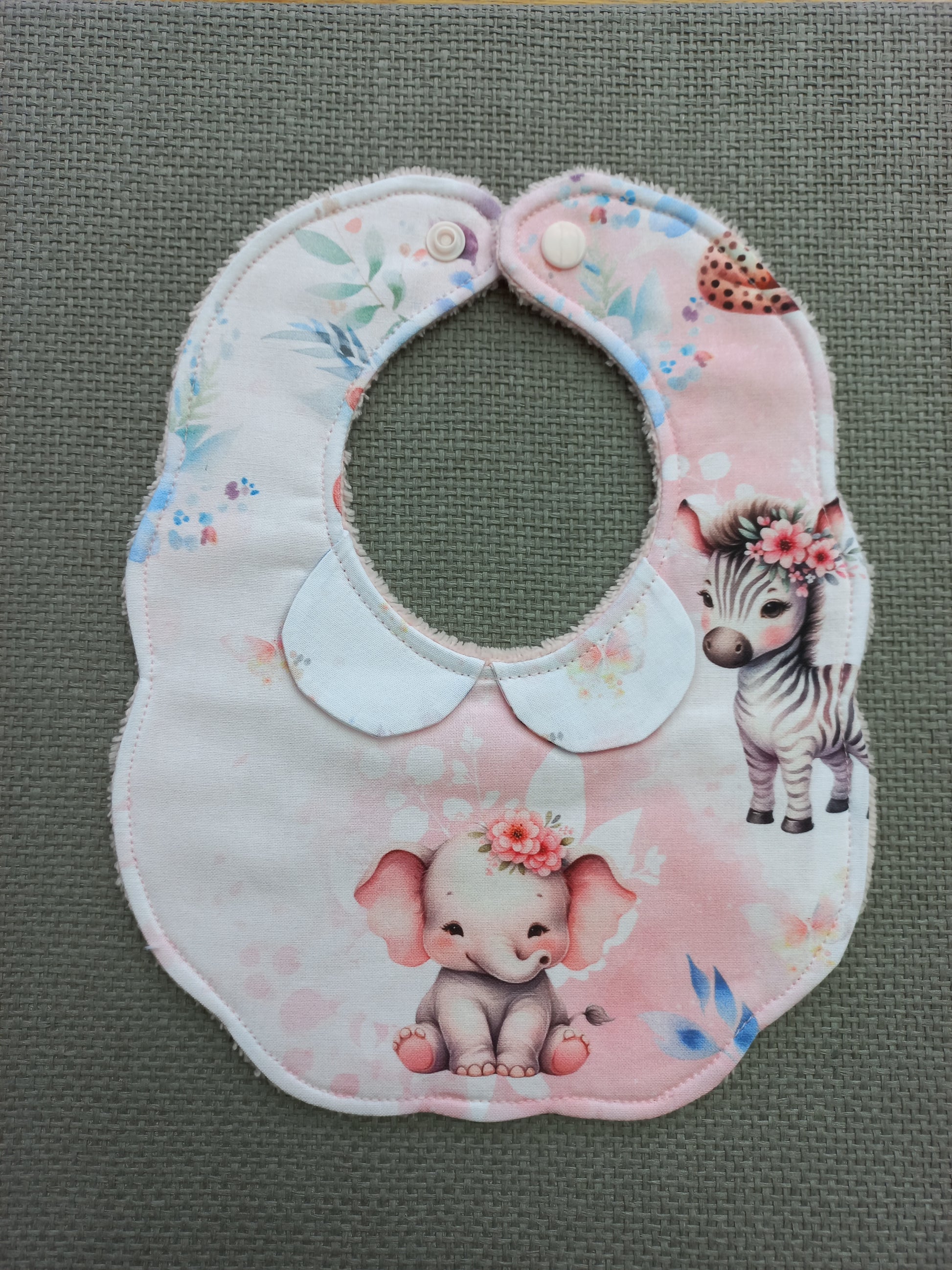 Une face tissu coton fond coloris blanc imprimé motifs bébés animaux de la savane (éléphant et zèbre) agrémenté d'un col Claudine cousu, une face tissu éponge bambou toute douce coloris rose pastel