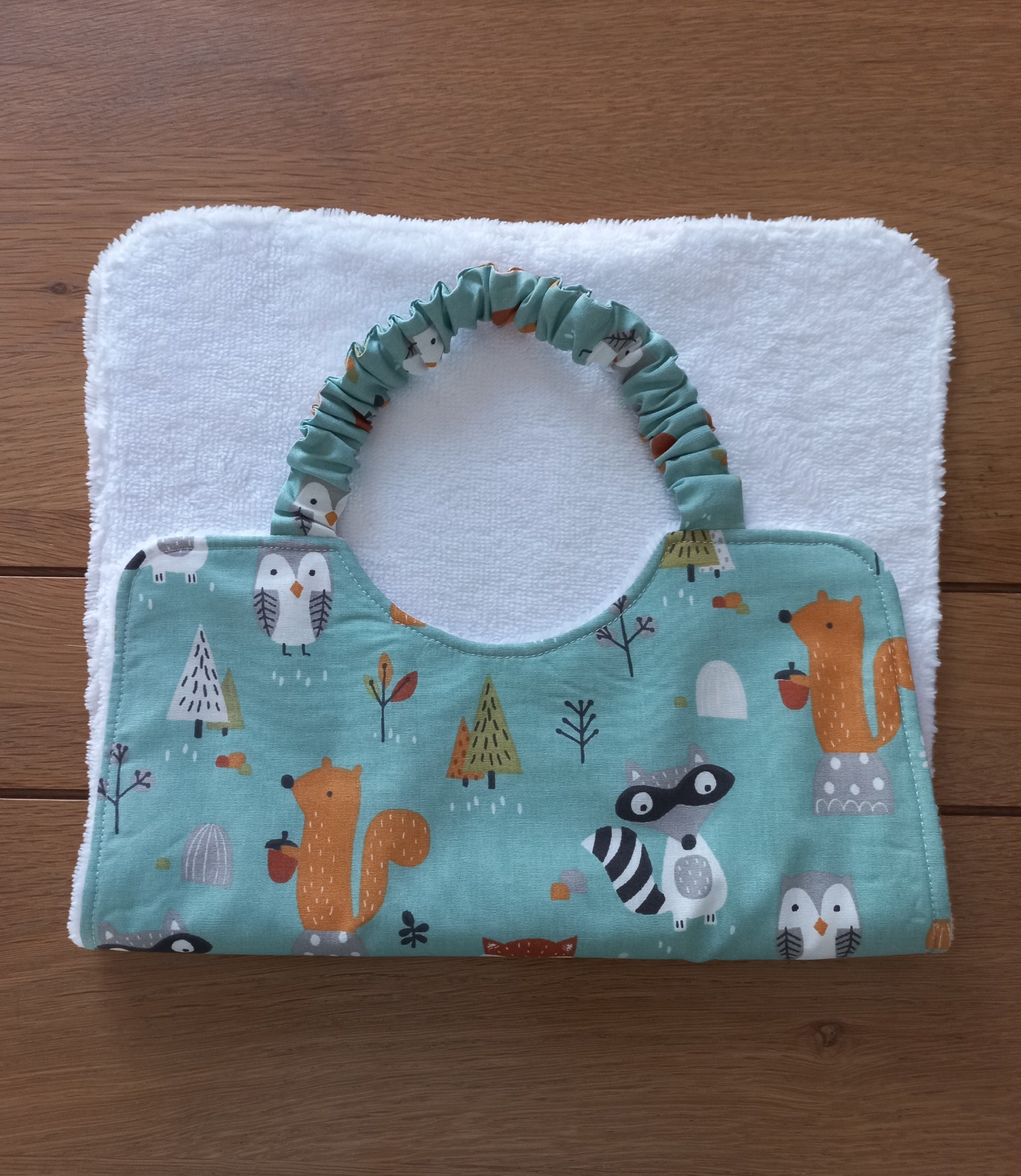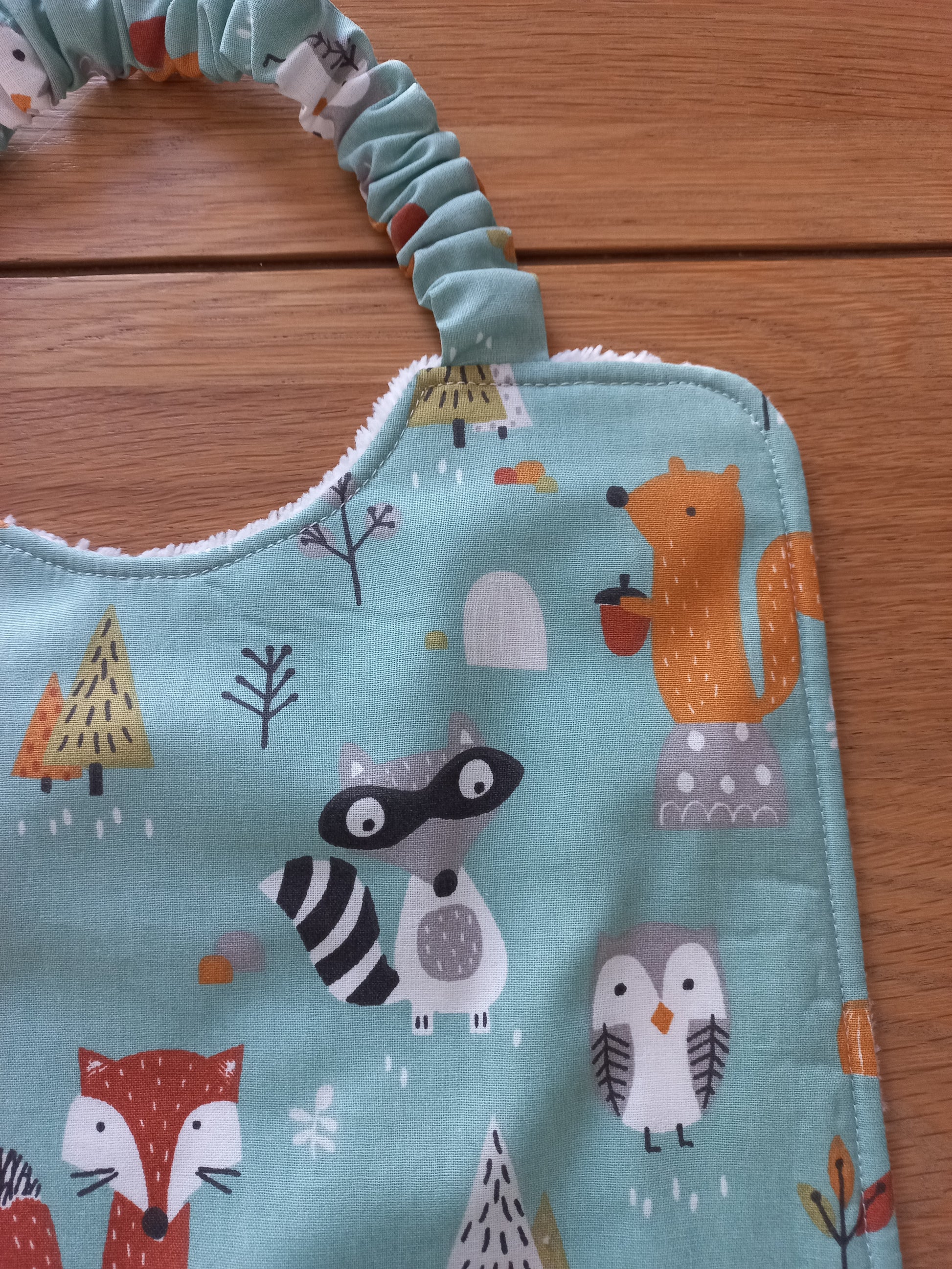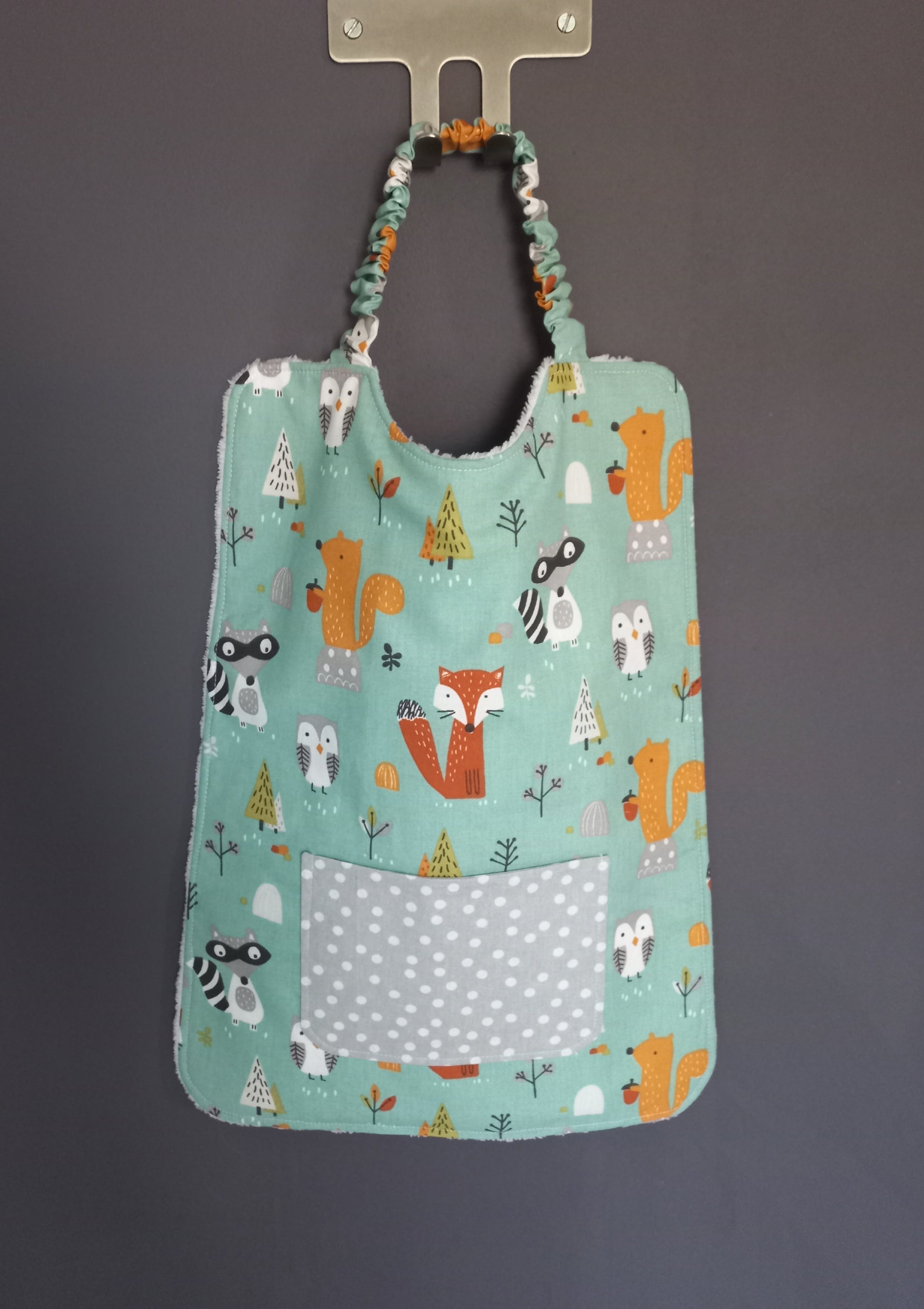 Une face tissu coton fond coloris bleu imprimé motifs animaux de la forêt avec poche doublée assortie tissu coton fond coloris gris clair imprimé motifs pois coloris blanc, une face tissu éponge bambou toute douce coloris blanc