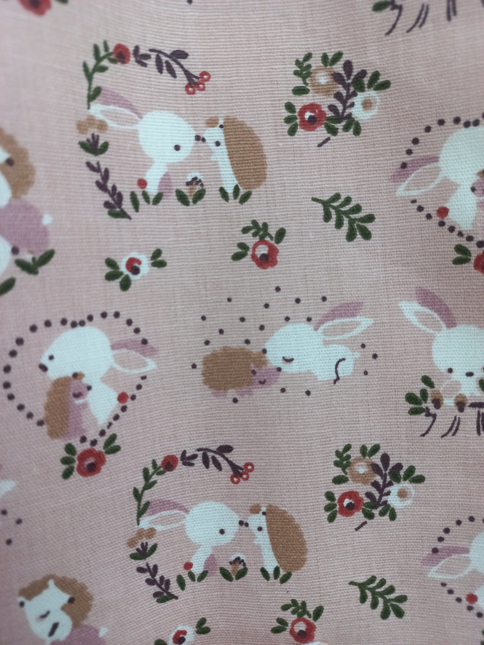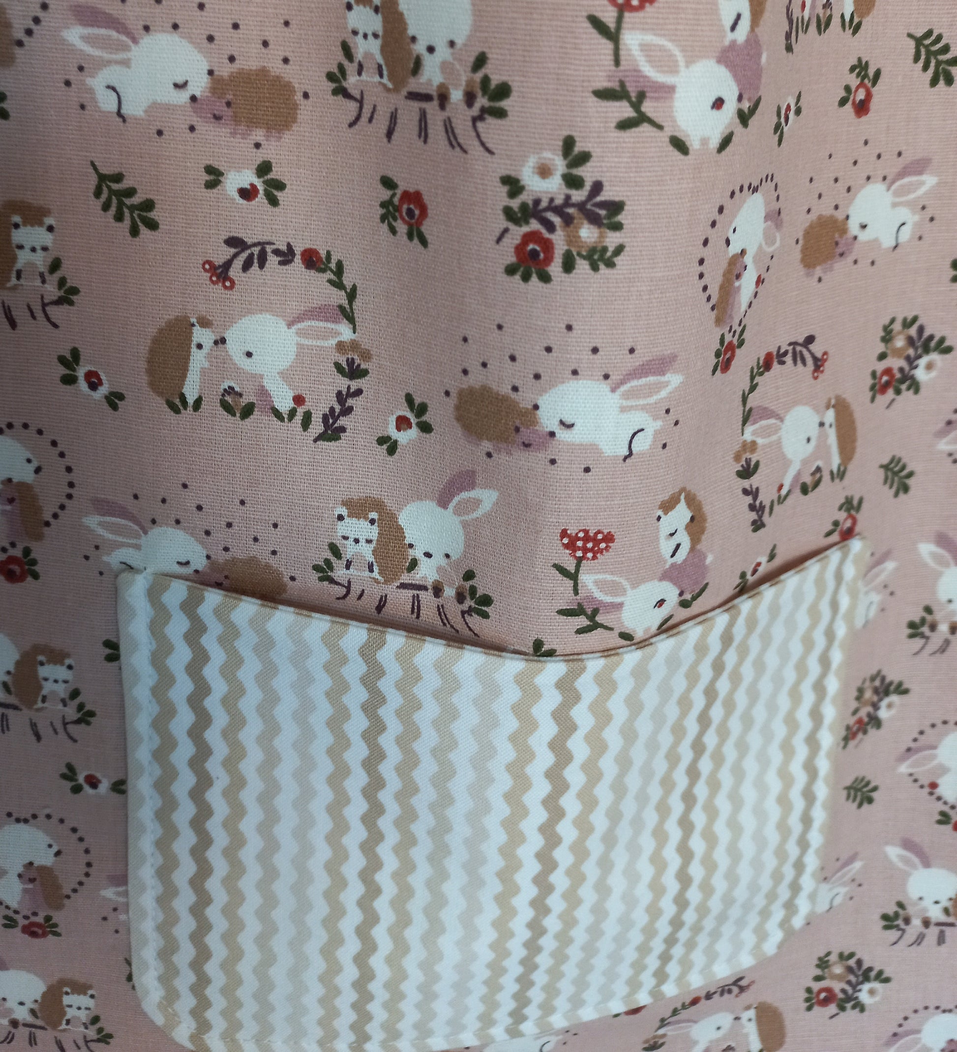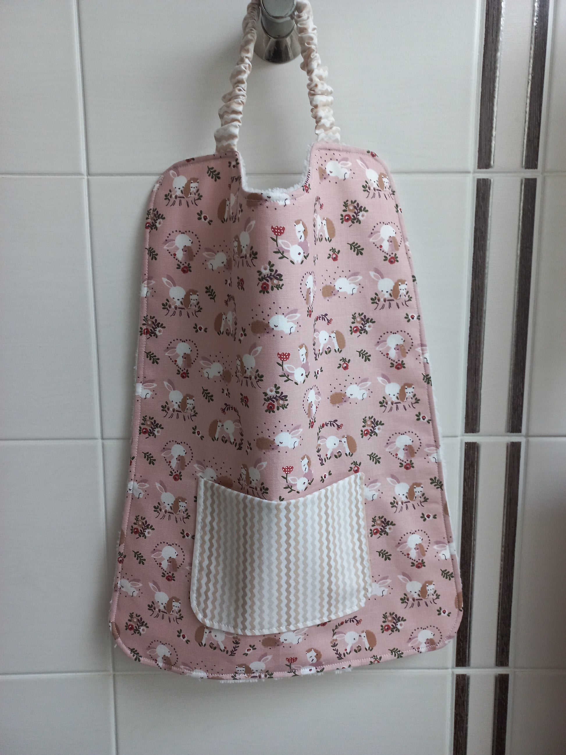 Une face tissu coton fond coloris rose saumon imprimé motifs fleurs, hérissons et lapins avec poche doublée tissu coton fond coloris blanc imprimé motifs zig-zags coloris assortis, une face tissu éponge bambou toute douce coloris blanc