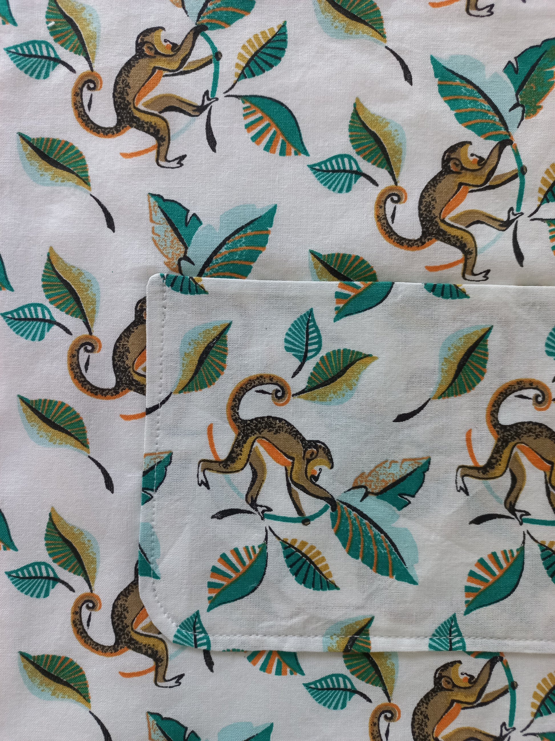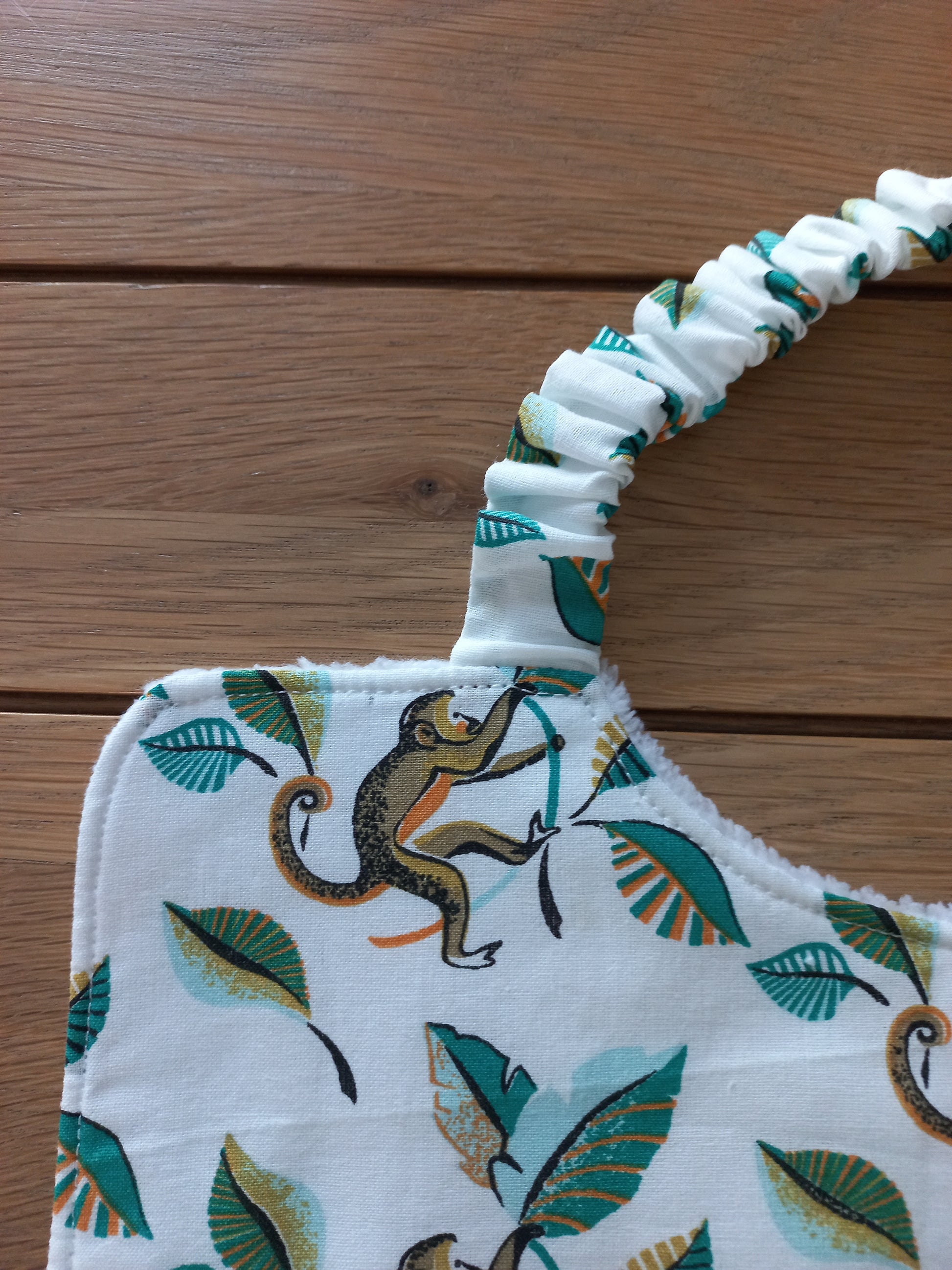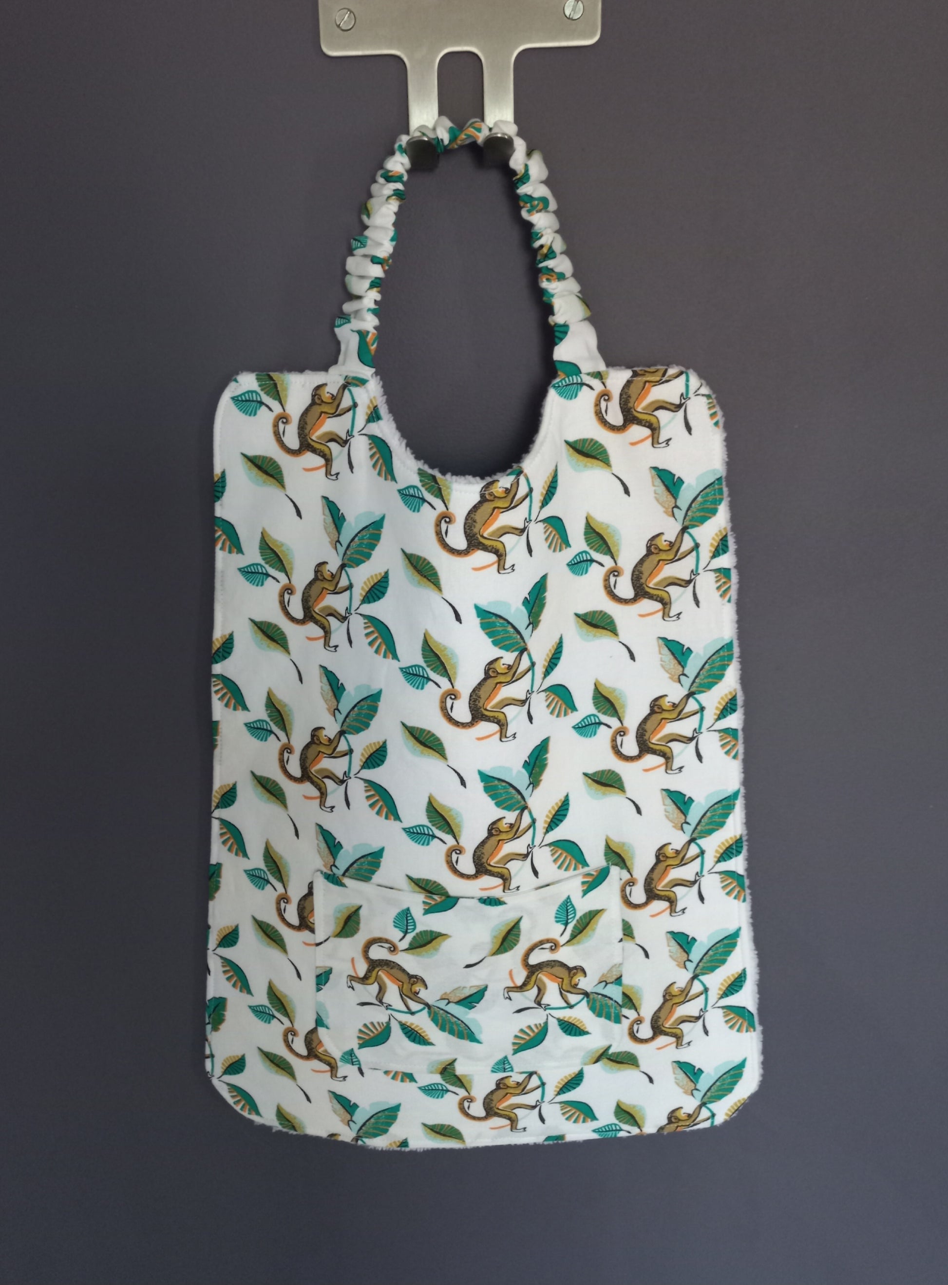 Une face tissu coton fond coloris blanc imprimé motifs singes avec poche doublée assortie, une face tissu éponge bambou toute douce coloris blanc