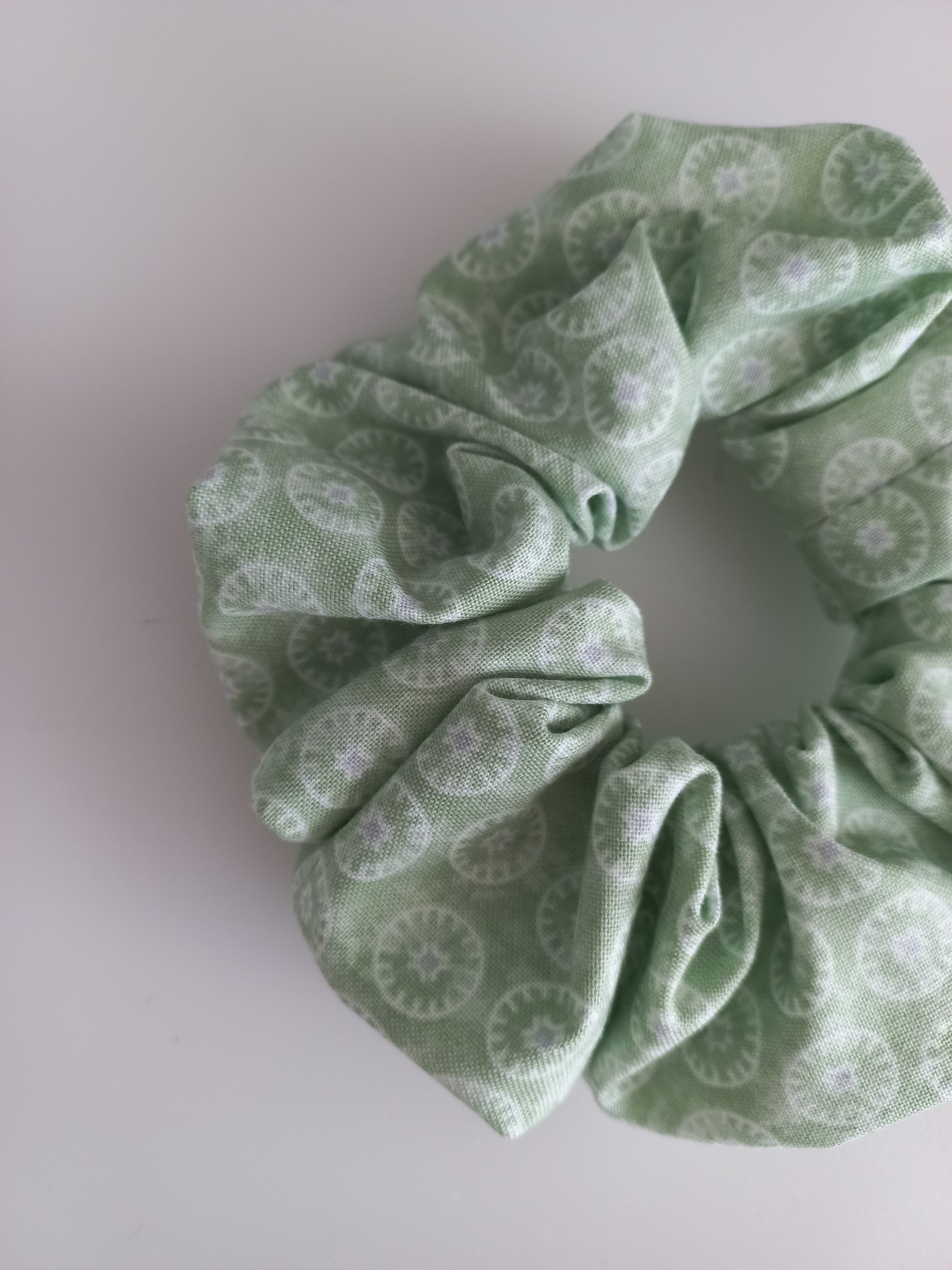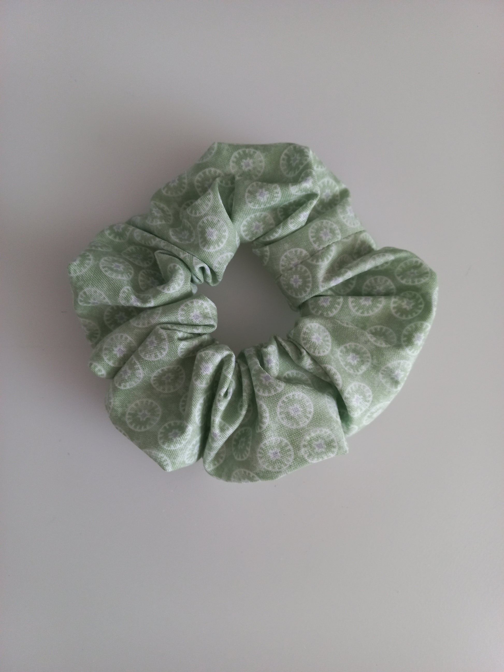 Tissu coton fond coloris vert amande imprimé motifs géométriques ronds coloris blanc avec élastique