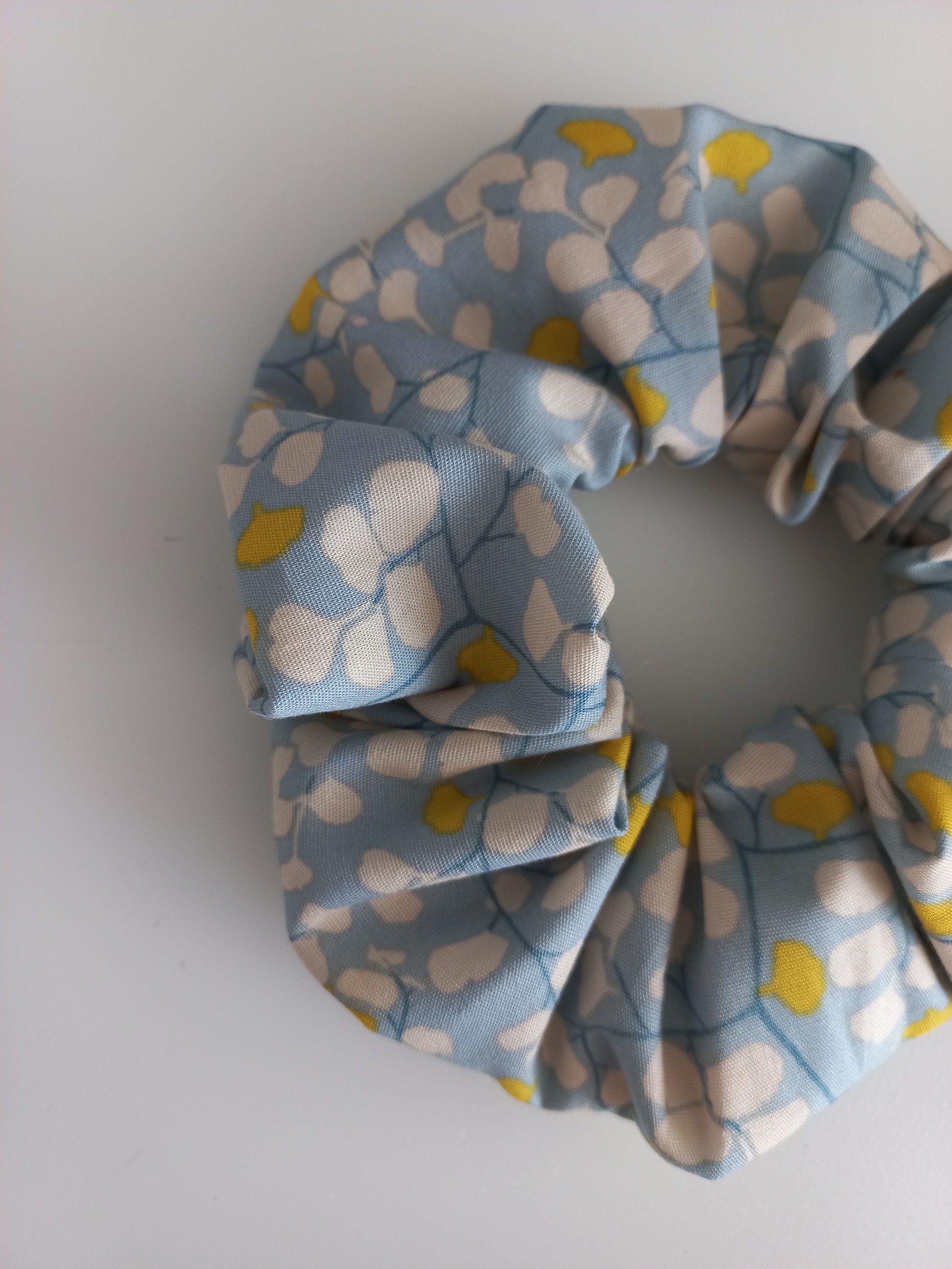 Tissu coton fond coloris bleu ciel imprimé motifs petites fleurs ginkgo coloris écru et jaune avec élastique