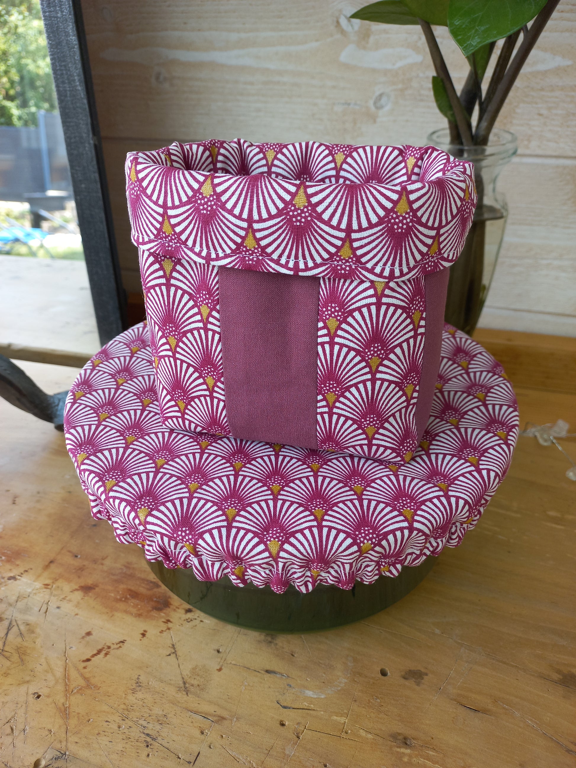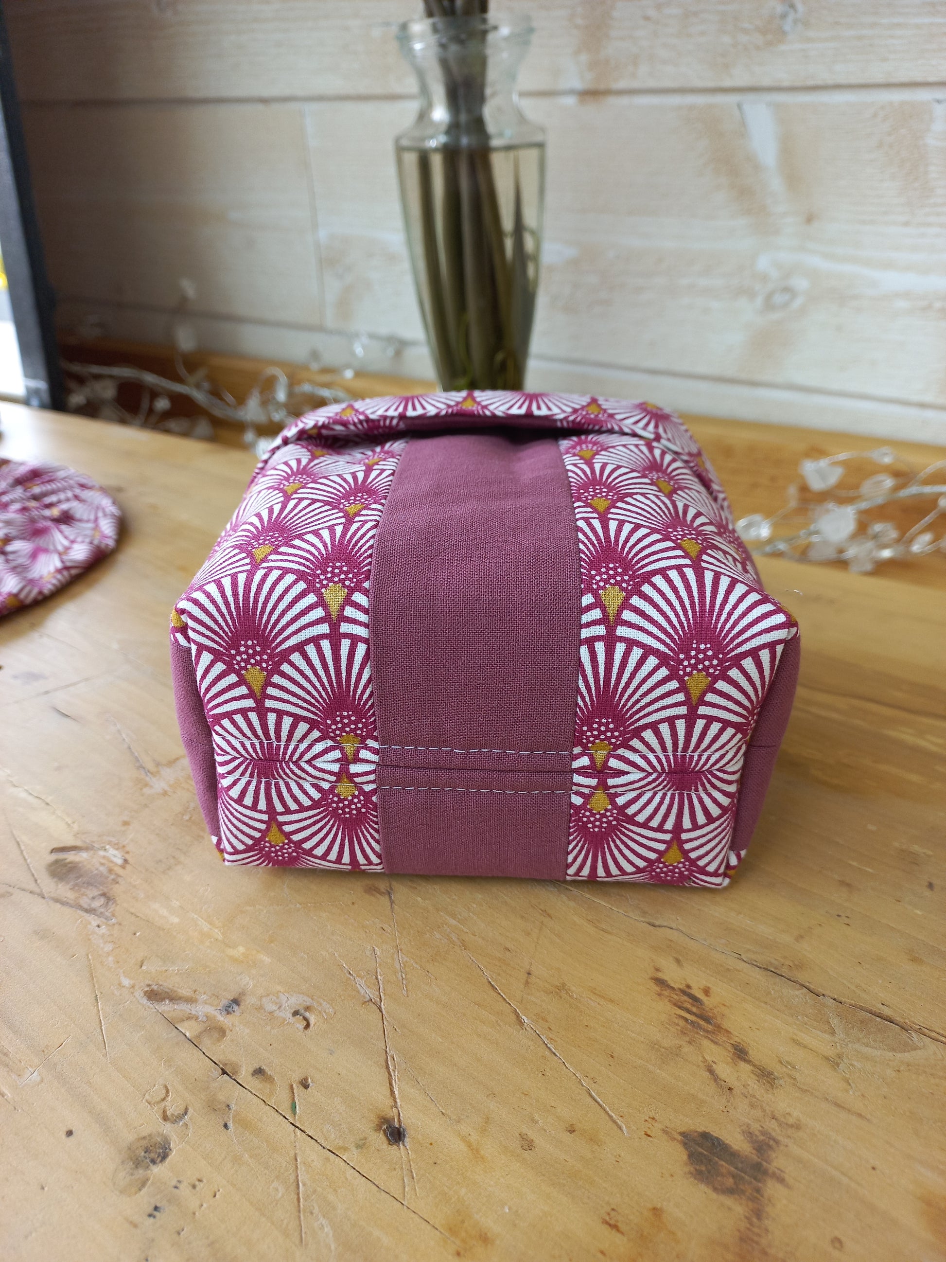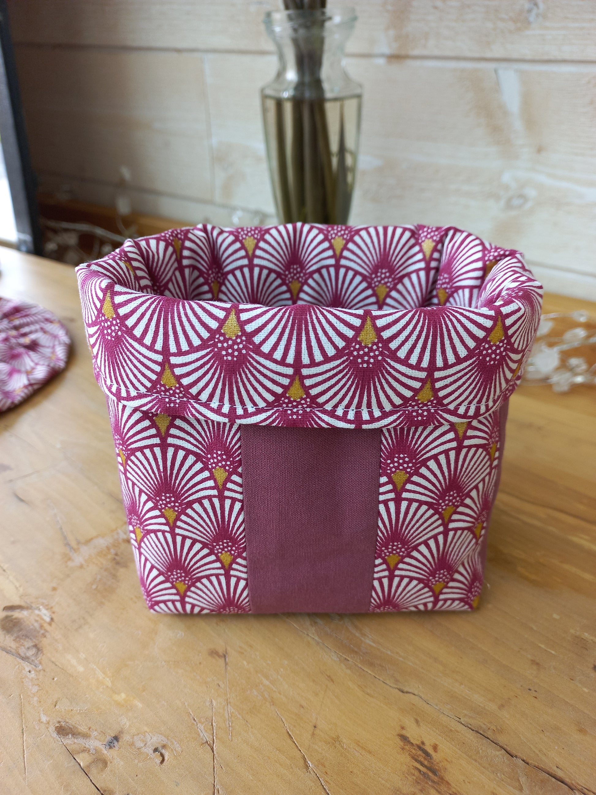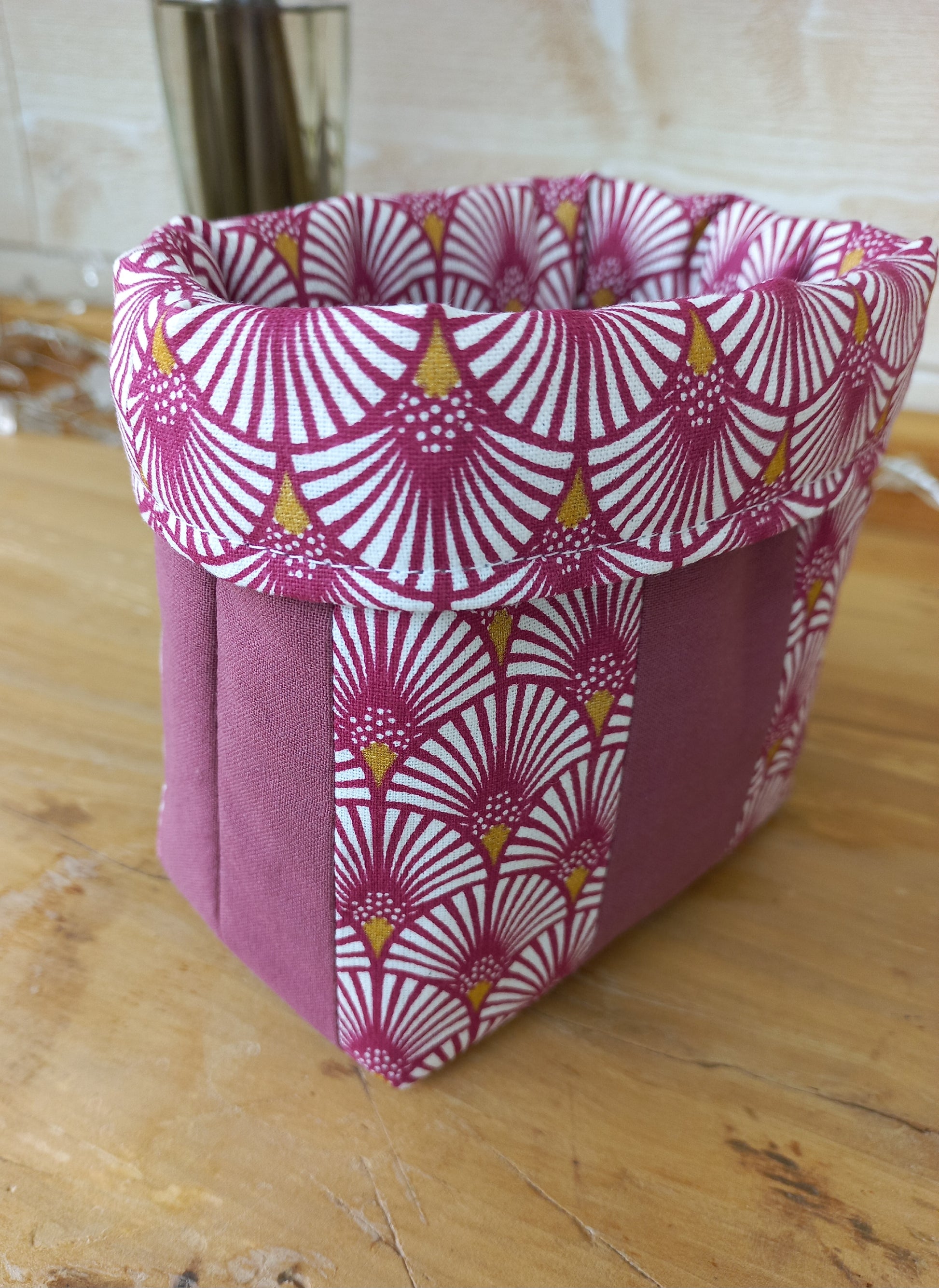Panier ouatiné réversible en tissu coton uni coloris violine et tissu coton motifs style éventails coloris blanc, doré et violine
