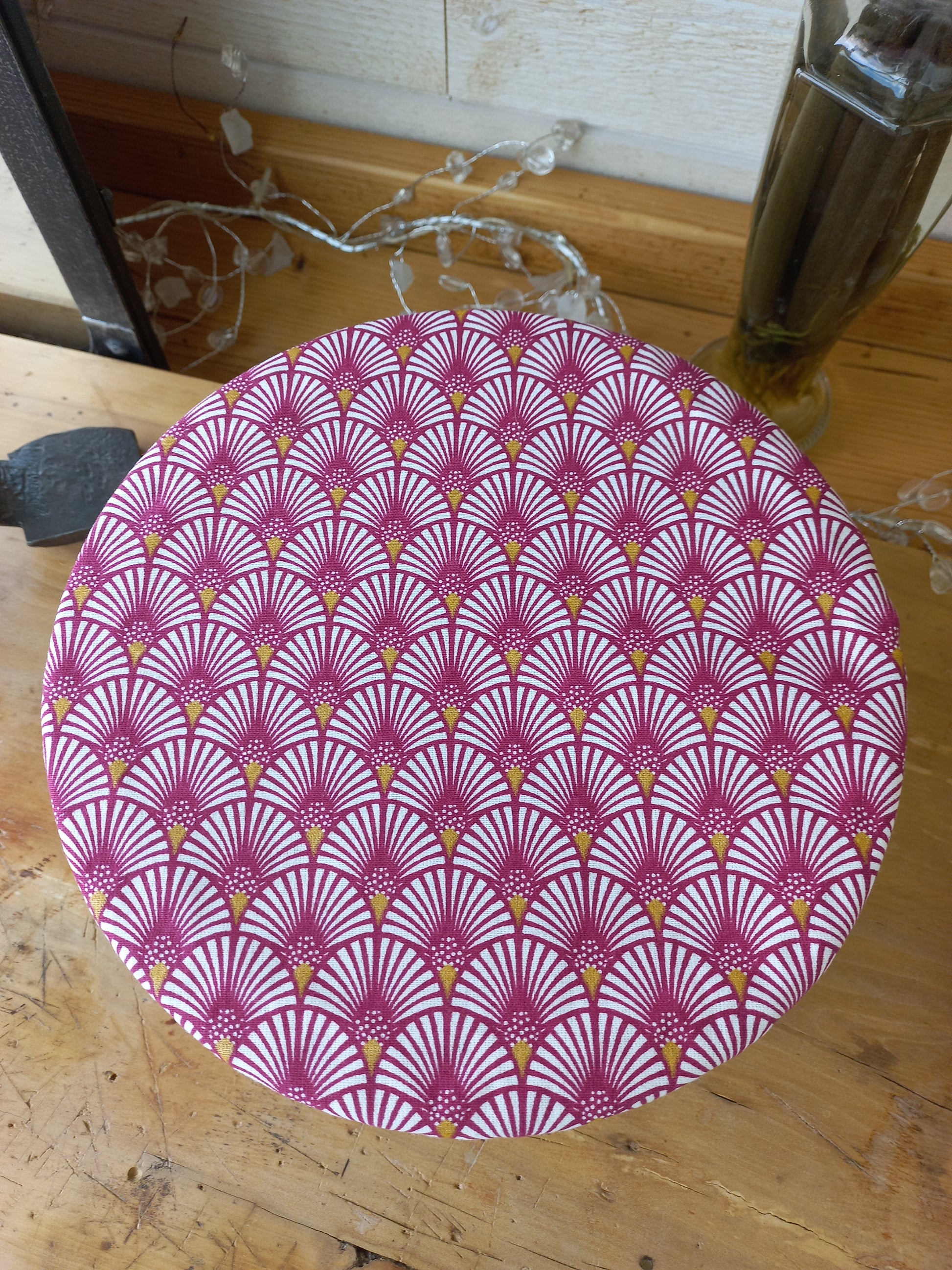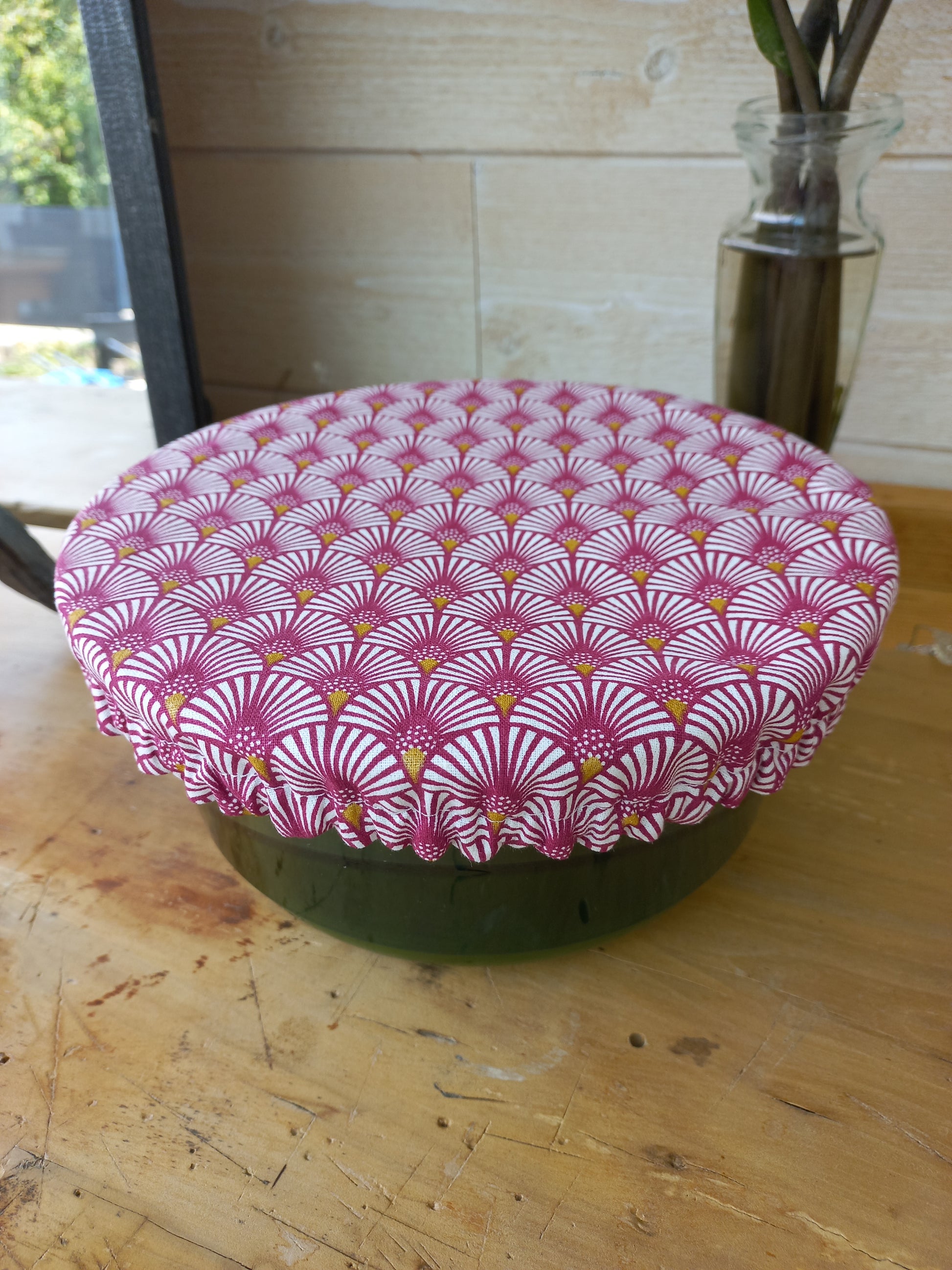 Charlotte réversible en tissu coton motifs style éventails coloris blanc, doré et violine avec élastique / Utilisable pour des plats de diamètre 20 cm maximum