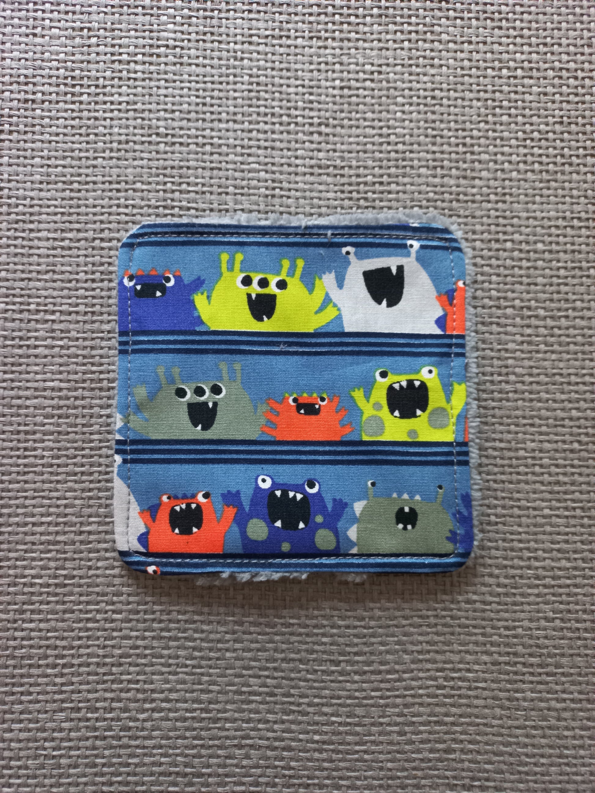 Une face tissu coton fond coloris gris bleu foncé imprimé motifs petits monstres / Une face tissu éponge bambou toute douce coloris gris foncé