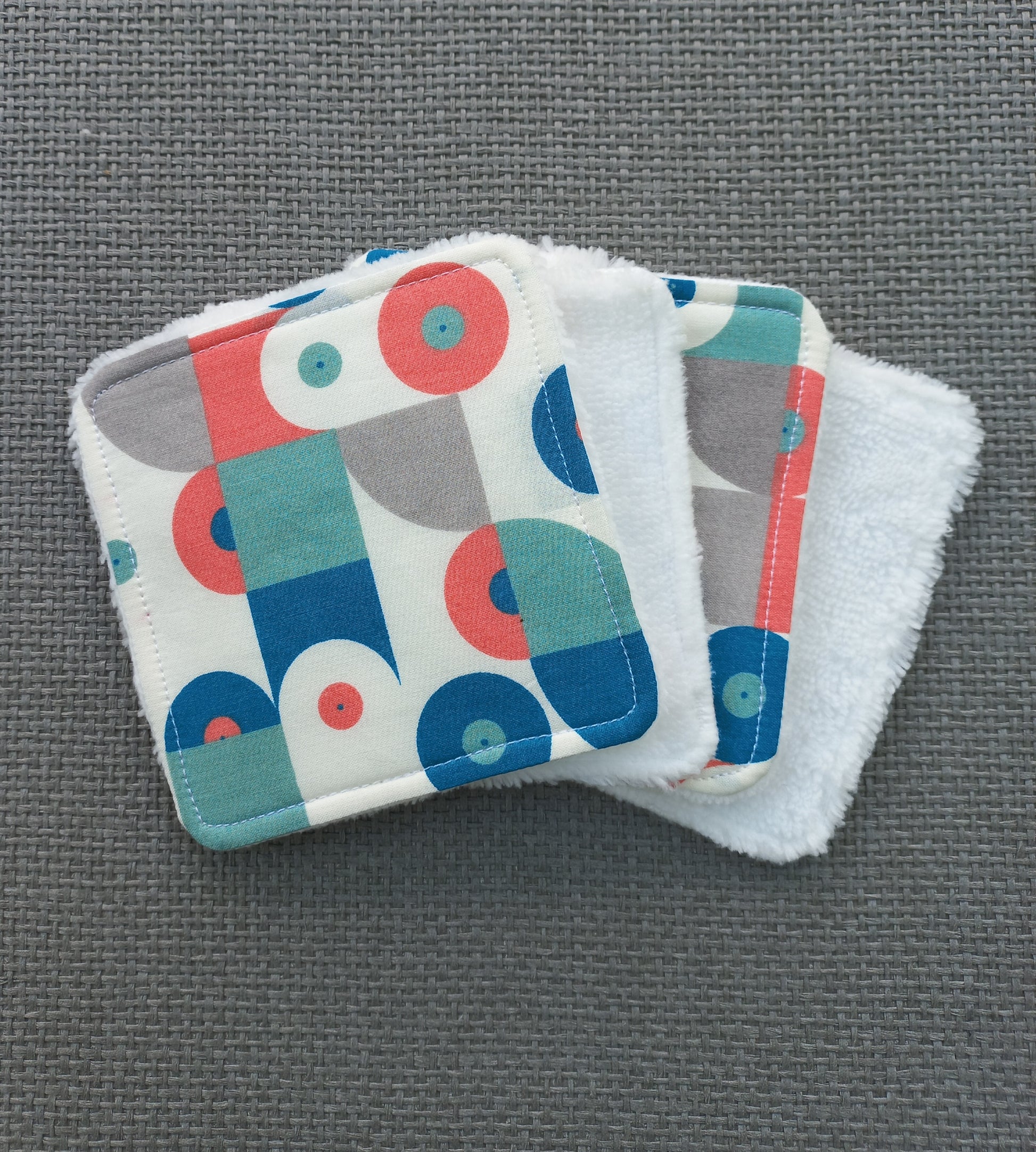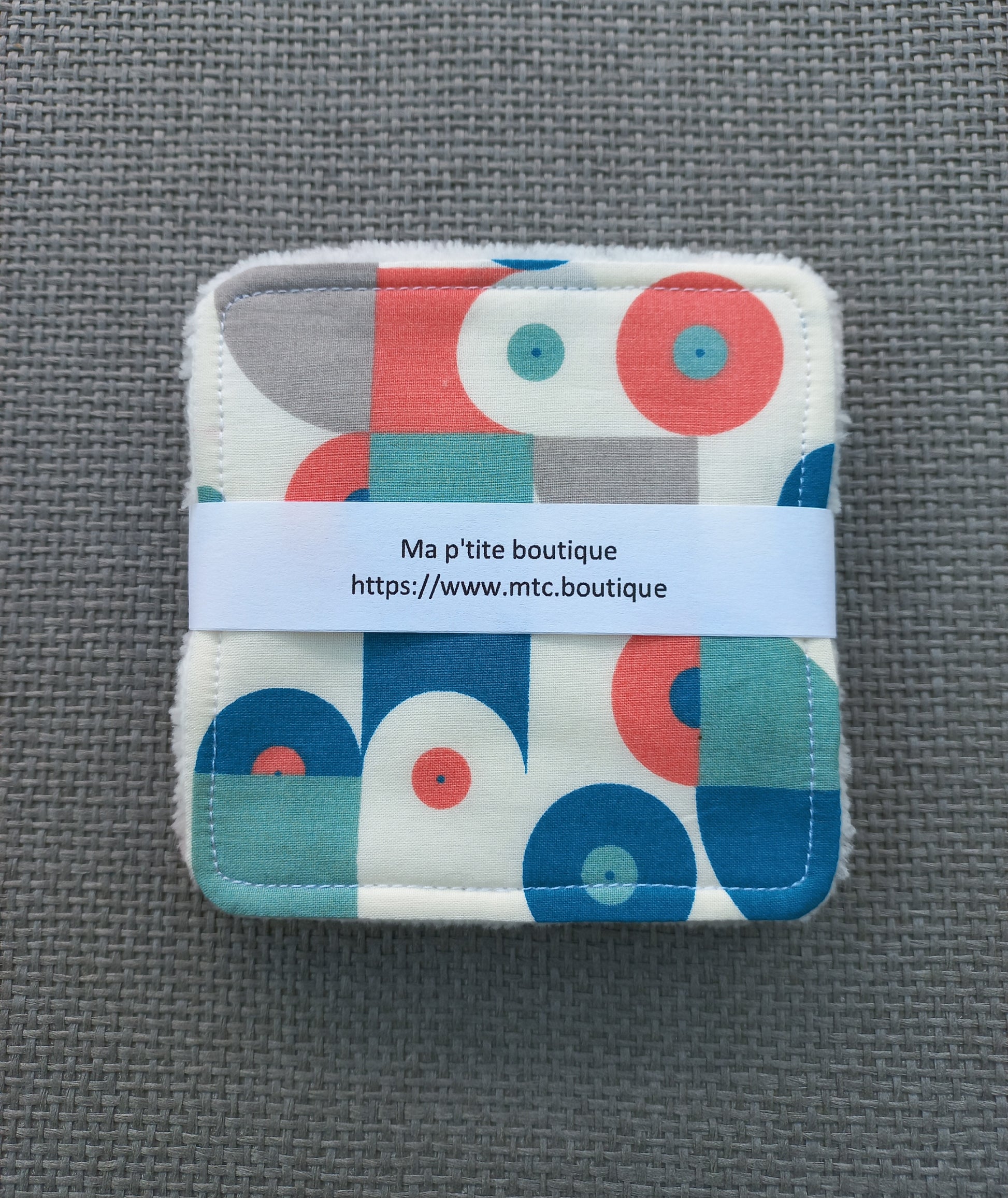 Une face tissu coton fond coloris écru imprimé motifs géométriques coloris bleu, gris et saumon / Une face tissu éponge bambou toute douce coloris blanc