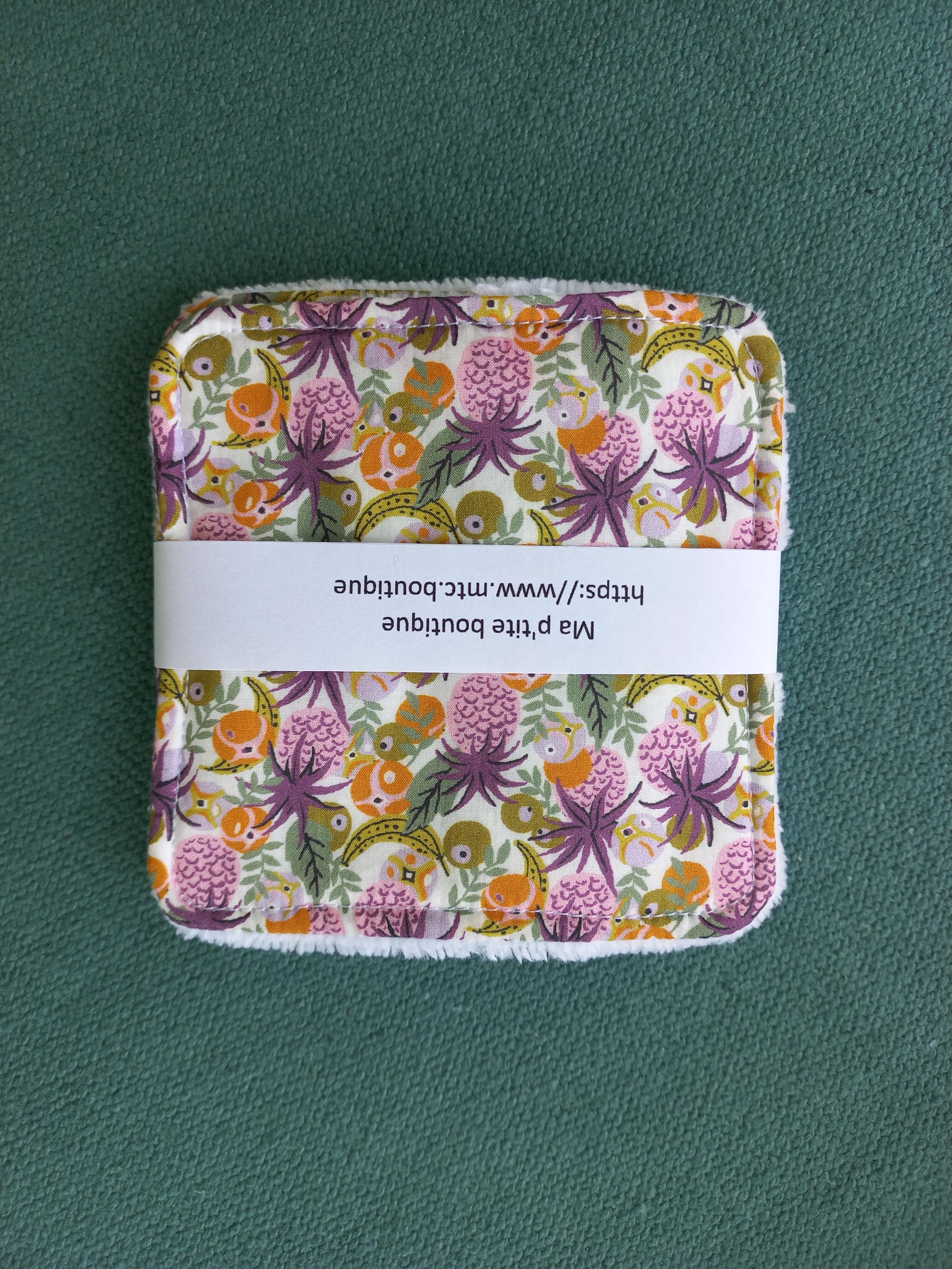 Une face tissu coton fond coloris blanc imprimé motifs exotiques : ananas, bananes... / Une face tissu éponge bambou toute douce coloris blanc