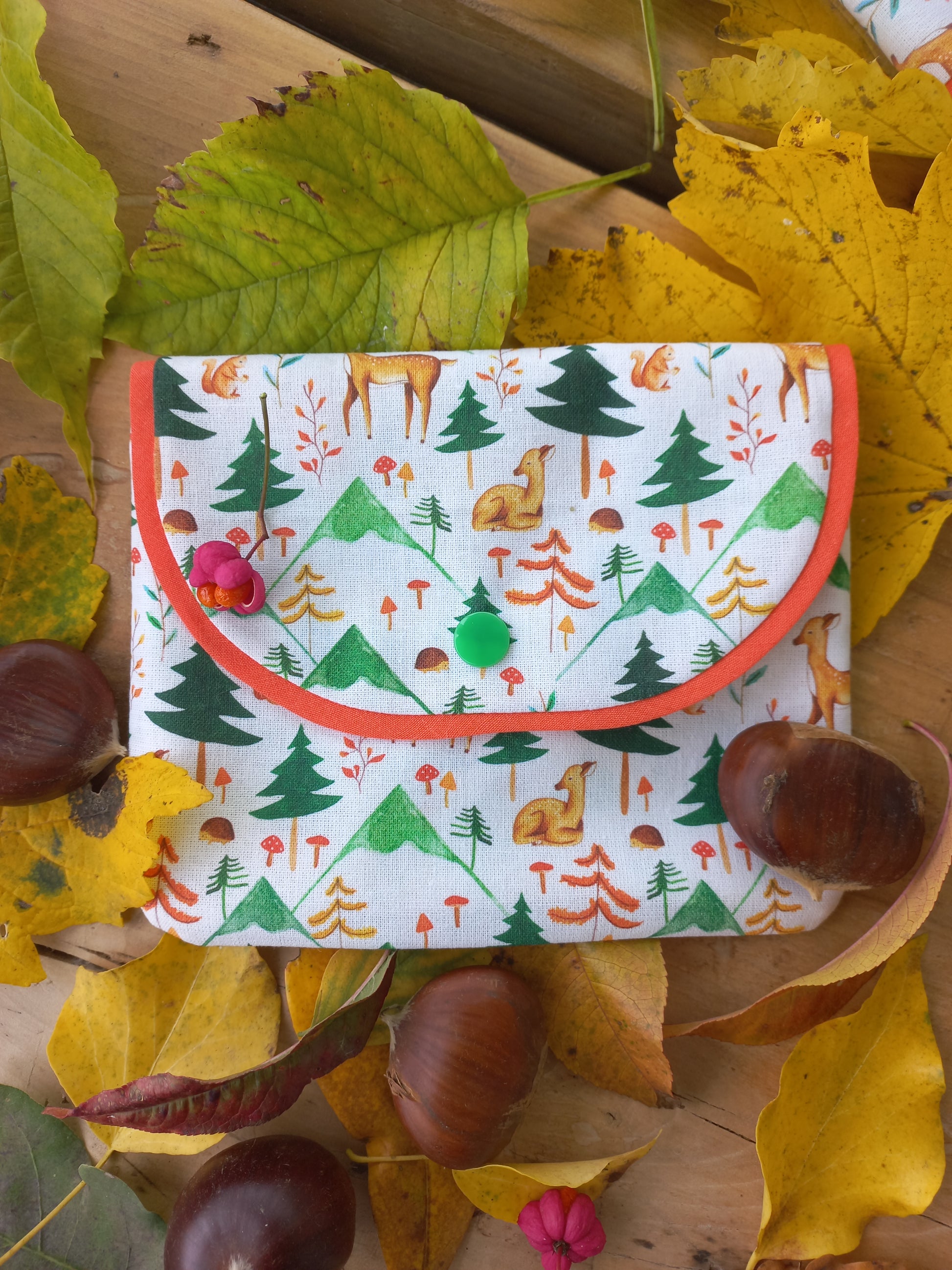 Extérieur et intérieur tissu coton fond coloris blanc imprimé motifs automne : champignons, biches, sapins... / Rabat forme arrondie agrémenté d'un ruban biais coloris orange / Fermeture par bouton pression coloris vert