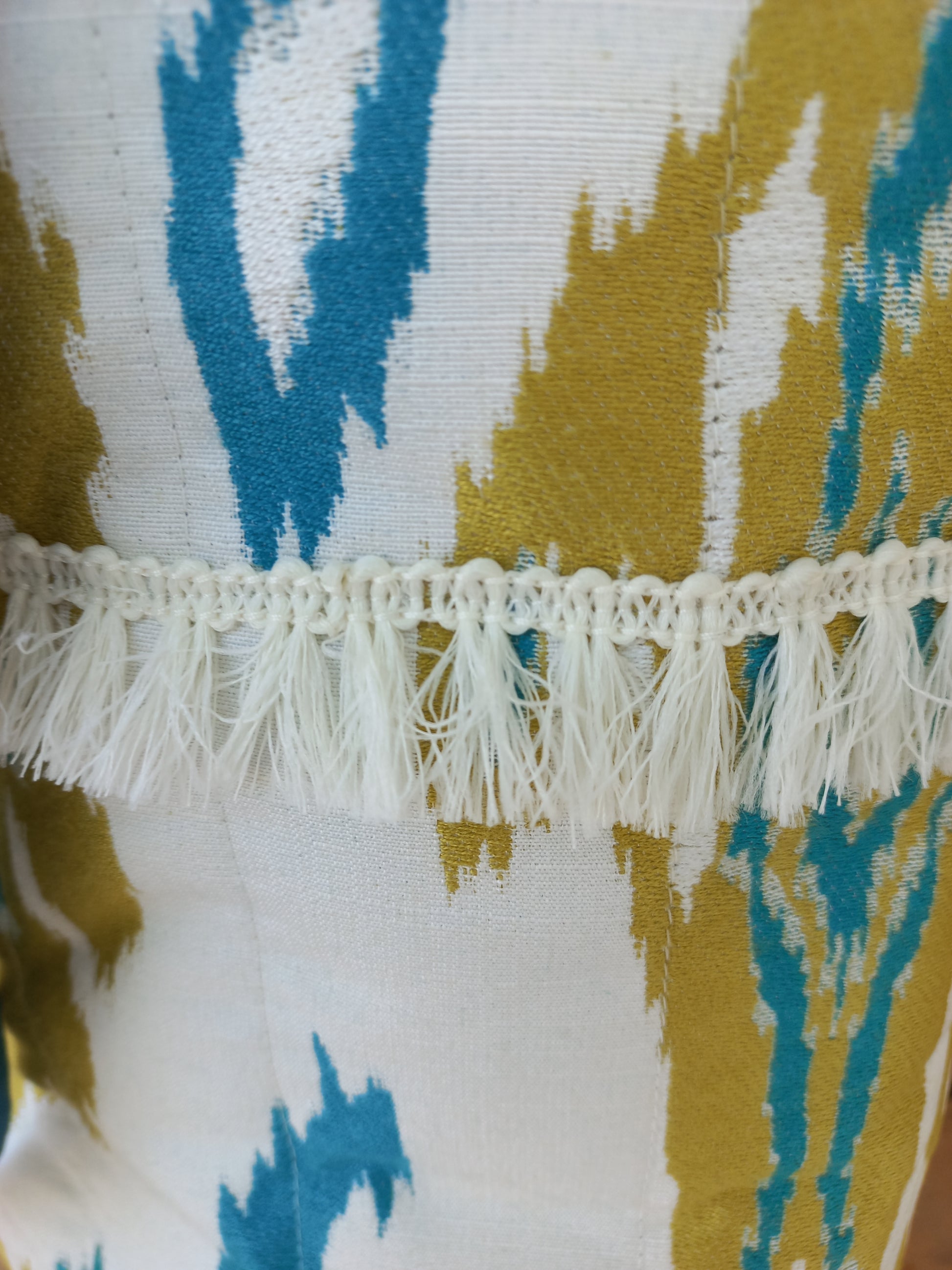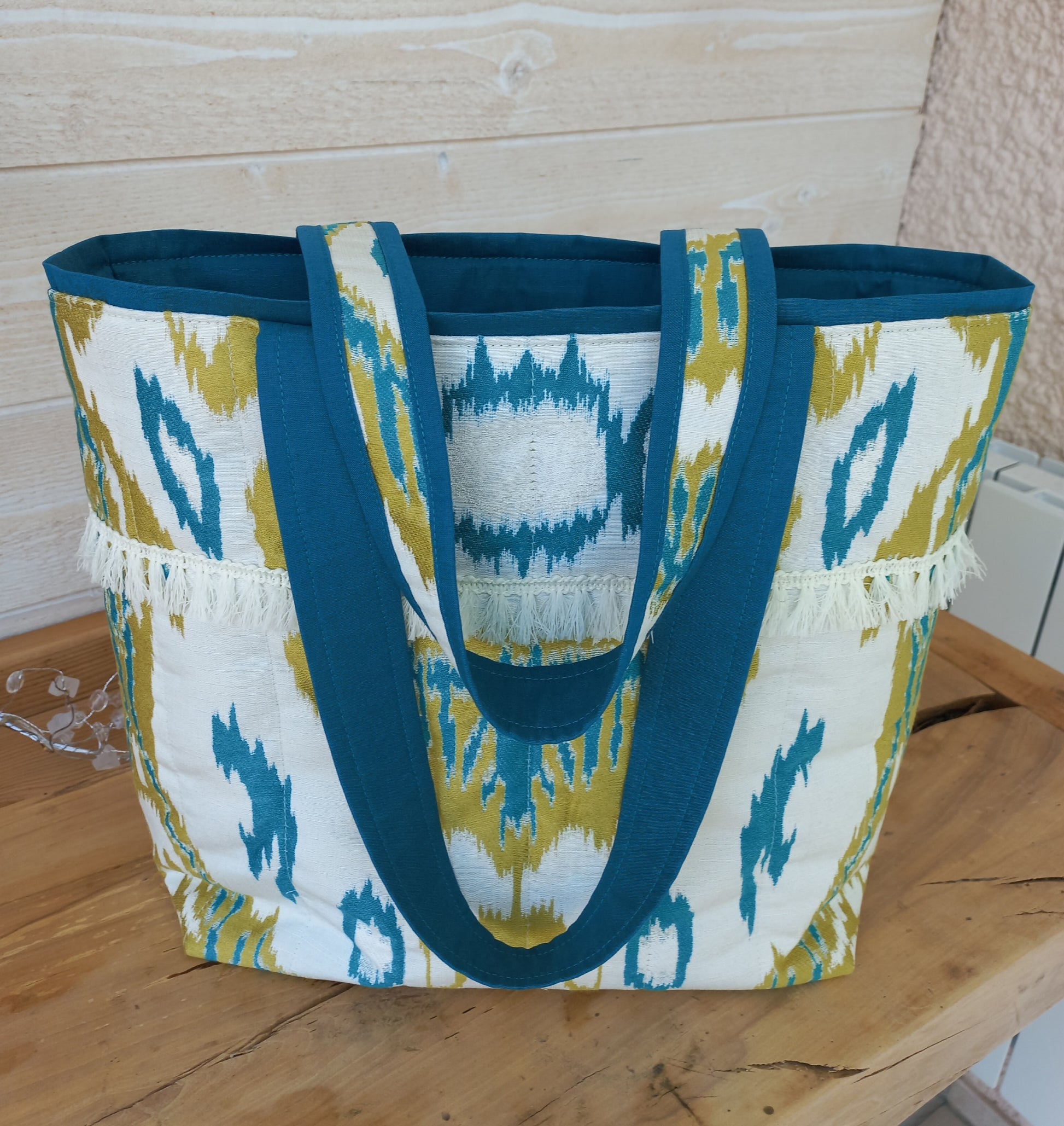 Extérieur : tissu issu d'un coupon d'ameublement en polyester et coton ouatiné et surpiqué par moi-même fond coloris écru imprimé motifs stylisés coloris jaune moutarde et vert émeraude / Ruban franges coloris écru cousu